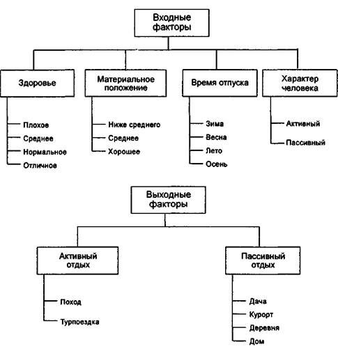 Пример 17.3. Если теперь ввести структуру из примера 17.2 в базу знаний какой-либо продукционной оболочки (например, ExSys), то можно получить экспертную систему, которая, задавая вопросы о вашем здоровье, материальном положении, времени отпуска, характере, поможет вам выбрать наиболее подходящий вид отдыха. Каждой строке таблицы будет соответствовать правило "Если — то". Например: Правило I: "Если здоровье отличное или хорошее и материальное положение хорошее и характер активный, то поход (степень уверенности = 8) или турпоездка (степень уверенности = 7)".