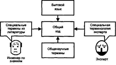 • неологизмов, созданных экспертом за время работы (его профессиональный жаргон). Если считать, что бытовой и общенаучный языки у двух участников общения примерно совпадают, то некоторый общий язык, или код, который необходимо выработать партнерам для успешного взаимодействия, будет складываться из потоков, представленных на рис. 17.6. В дальнейшем этот общий код преобразуется в некоторую понятийную (семантическую) сеть, которая является прообразом поля знаний предметной области.