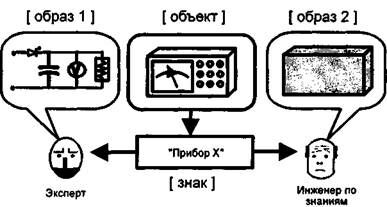 Рис. 17.7 дает представление о неоднозначности интерпретации терминов двумя специалистами. В семиотике, науке о знаковых системах, проблема интерпретации является одной из центральных. Интерпретация связывает "знак" и "означаемый предмет". Только в интерпретации знак получает смысл. Так, на рис. 17.7 слова "прибор X" для эксперта означают некоторую конкретную схему, которая соответствует схеме оригинала прибора, а в голове начинающего аналитика слова "прибор X" вызывают пустой образ или некоторый "черный ящик" с ручками.