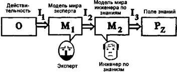 Инженерия знаний как наука, если можно так выразиться, дважды гносеологична — действительность (О) сначала отражается в сознании эксперта (Mi), а затем деятельность и опыт эксперта интерпретируются сознанием инженера по знаниям (М2), что служит уже основой для построения третьей интерпретации (Pz) — поля знаний экспертной системы (рис. 17.8). Процесс познания в сущности направлен на создание внутреннего представления окружающего мира в сознании человека.