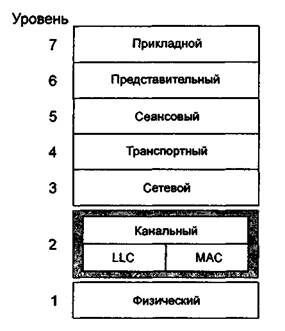 Для того чтобы учесть требования физической передающей среды, используемой в ЛВС, была произведена некоторая модернизация семиуровневой модели взаимодействия открытых систем для локальных вычислительных сетей. Необходимость такой модернизации была вызвана тем, что для организации взаимодействия абонентских ЭВМ в ЛВС используются специальные методы доступа к физической передающей среде. Верхние уровни модели ВОС не претерпели никаких изменений, а канальный уровень был разбит на два подуровня (рис. 6.17). Подуровень LLC (Logical Link Control) обеспечивает управление логическим звеном, т.е. выполняет функции собственно канального уровня. Подуровень MAC (Media Access Control) обеспечивает управление доступом к среде. Основные методы управления доступом к физической передающей среде будут рассмотрены в подразд. 6.3.
