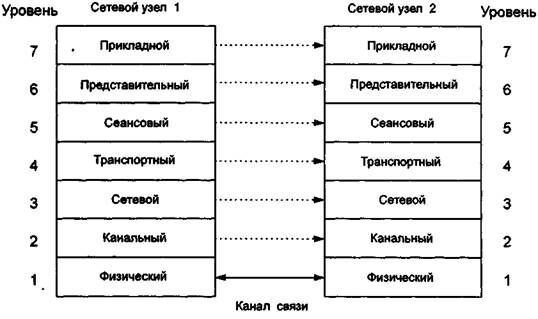Взаимодействие двух узлов из различных сетей схематически показано на рис. 6.18. Обмен информацией между одноименными уровнями определяется протоколами, речь о которых шла выше.