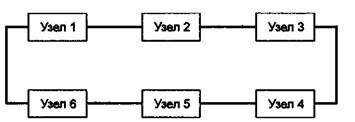 Кольцевая топология предусматривает соединение узлов сети замкнутой кривой — кабелем передающей среды (рис. 6.22). Выход одного узла сети соединяется со входом другого. Информация по кольцу передается от узла к узлу. Каждый промежуточный узел между передатчиком и приемником ретранслирует посланное сообщение. Принимающий узел распознает и получает только адресованные ему сообщения.