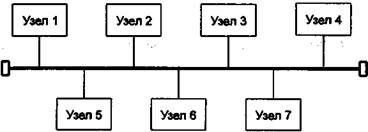 Шинная топология — одна из наиболее простых (рис. 6.23). Она связана с использованием в качестве передающей среды коаксиального кабеля. Данные от передающего узла сети распространяются по шине в обе стороны. Промежуточные узлы не транслируют поступающих сообщений. Информация поступает на все узлы, но принимает сообщение только тот, которому оно адресовано. Дисциплина обслуживания параллельная.