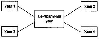 Звездообразная топология (рис. 6.24) базируется на концепции центрального узла, к которому подключаются периферийные узлы. Каждый периферийный узел имеет свою отдельную линию связи с центральным узлом. Вся информация передается через центральный узел, который ретранслирует, переключает и маршрутизирует информационные потоки в сети