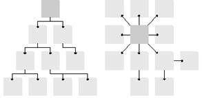 Рис. 1. Типичная структура сайта (слева) и типичная структура программы. Если сайты обычно разветвлены, в том смысле, что функции обычно размещаются в отдельных экранах, то программы обычно имеют только один изменяющийся экран, в котором и вызываются почти все функции.