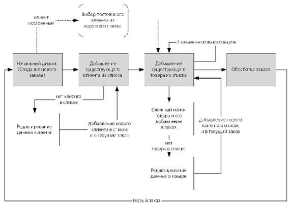 Результатом этой работы должен быть список блоков с необходимыми пояснениями. В качестве примера рассмотрим гипотетическую программу ввода данных. От пользователя требуется выбрать из списка клиента (или добавить в список нового) и указать, какие именно товары клиент заказал (товары в список тоже можно добавлять). Несколько клиентов постоянно что-то заказывают, так что заставлять пользователя каждый раз искать в списке такого клиента неправильно. При этом блоки разделяются следующим образом: