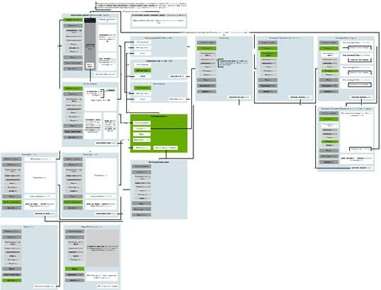 Пора свести всё это воедино. Работа эта довольно скучная и утомительная, но и от неё есть существенная польза. Рисовать такую схему гораздо легче, чем делать прототип, множество же ошибок можно выловить и в ней, не переделывая прототипа. Рисовать схему очень удобно в уже упоминавшейся Visio. Результат должен выглядеть примерно так: