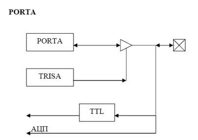 • Порт А - 6-разрядный. Может быть настроен как аналоговые входы АЦП источника опорного напряжения, выбора -СS в режиме SРI. Вывод RА4 - выход с открытым стоком (основная функция).