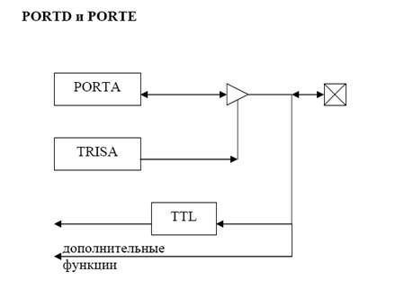 Каждый вывод порта может индивидуально настраиваться на ввод или вывод установкой соответствующего бита в регистре направления данных ТRISх, где х - имя порта А...Е. Если бит имеет значение 1. то соответствующая линия порта настроена на ввод, если 0 - на вывод. Для вывода/чтения бита достаточно записать, считать соответствую шее значение регистра РОRТх.