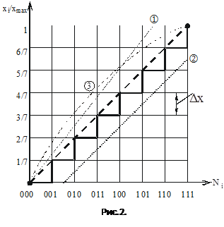 На рис. 2 изображена ХП 3-х разрядного ЦАП (n=3). По оси абсцисс откладываются значения входного двоичного кода Ni, а по оси ординат относительные значения выходного аналогового сигнала xi/xmax.