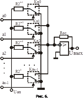 п ключей, по одному на каждый разряд, управляемых преобразуемым двоичным кодом N=(аn-1, an-2, … a1, a0); матрицы двоично-взвешенных резисторов; источника опорного напряжения Uоп; выходного операционного усилителя, с помощью которого суммируются токи, протекающие через двоично-взвешенные сопротивления, для получения аналогового выходного сигнала uвых, пропорционального цифровому коду.