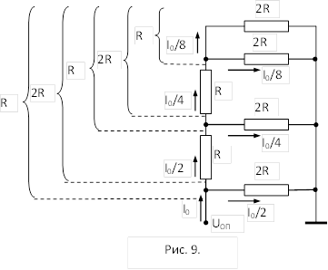 ЦАП с двумя номиналами сопротивлений (резистивной матрицей типа R – 2R) (рис.8) исключает эти сложности, благодаря наличию дополнительного резистора в каждом разряде.