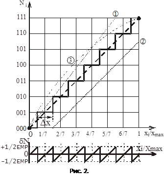 На рис. 2 показана характеристика преобразования однополярного АЦП и график изменения ошибок квантования.