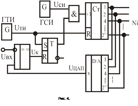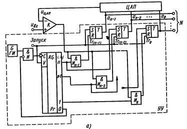 Типичная схема последовательного n-разрядного АЦП с единичным приближением представлена на рис. 4, а. В состав схемы включены следующие компоненты: генератор тактовых импульсов ГТИ, генератор счётных импульсов ГСИ, n-разрядный двоичный суммирующий счётчик СТ, n-разрядный ЦАП, аналоговый компаратор, RS-триггер и логический элемент И (конъюнктор).