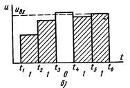Импульс начала цикла преобразования, который в дальнейшем будем называть импульсом запуска, подключает счетчик СТ2 к выходу генератора импульсов ГИ. Так как разряды счетчика соединены с разрядами ЦАП, то напряжение на выходе последнего uЦАП увеличивается по ступенчатому пилообразному закону (рис. 3б), причем значение ступени соответствует ЕМР АЦП. Процесс преобразования заканчивается, когда напряжение uЦАП сравняется с входным напряжением uВХ. При этом компаратор К формирует сигнал, устанавливающий триггер в нулевое состояние. Элемент И закрывается, чем прекращает поступление счетных импульсов на счетчик. Этим определяется момент окончания преобразования и осуществляется считывание с выходов счетчика выходного кода N, представляющего цифровой эквивалент входного напряжения.