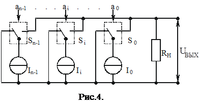 Входной код an-1,...ai,...a0 управляет ключами S n-1,…Si,...S0, которые или подключают источники тока к нагрузке, или замыкают их накоротко. При этом, если ai=0, то соответствующий источник закорочен и в работе схемы не участвует. Если же ai= 1, то соответствующий источник тока подключен к нагрузке. Результирующий ток равен сумме токов опорных источников, для которых ai = 1. Напряжение на выходе будет равно результирующему току