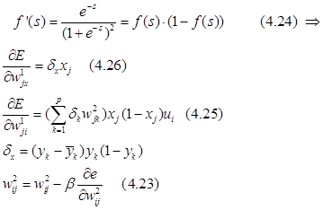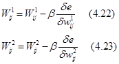 Обучение сети производиться известным оптимизационным методов градиентного спуска, то есть на каждой итерации изменение веса производиться по формулам: