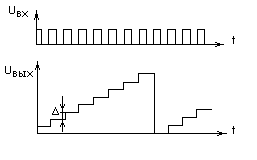 построен двоичный счетчик. Если подать на вход этого счетчика последовательность импульсов, то с приходом каждого очередного импульса число в счетчике будет увеличиваться на единицу и напряжение на выходе ЦАП будет возрастать на ступеньку, соответствующую единице младшего разряда счетчика. Величина такой ступеньки