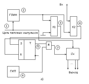 В течение времени Т с выхода триггера подается высокое напряжение на вход элемента И, и импульсы генератора импульсной последовательности (ГИП) проходят через элемент на вход счётчика (Сч). Очевидно, устанавливающееся в счетчике число пропорционально Т, а следовательно и