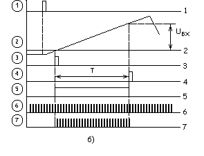 Время Т, в течение которого триггер находится в состоянии 1, пропорционально входному напряжению. Таким образом, входное напряжение преобразуется во временной интервал.