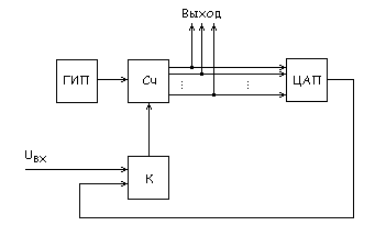 , при котором компаратор К подает на вход элемента И уровень лог. 1. При этом импульсы генератора импульсной последовательности ГИП проходят через элемент И на вход счетчика. Каждый поступивший на вход счетчика импульс вызывает увеличение на единицу хранившегося в нём числа, на одну элементарную ступеньку возрастает напряжение на выходе ЦАП. Таким образом, напряжение