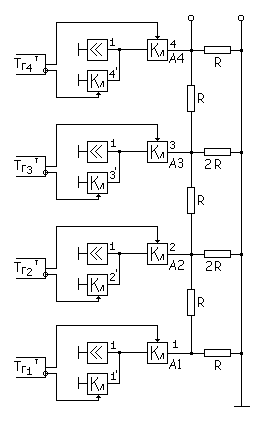 Обратим внимание на то, что коэффициенты передачи усилителя с отдельных его входов находятся в том же соотношении, что и весовые коэффициенты соответствующих разрядов двоичного числа. Так,