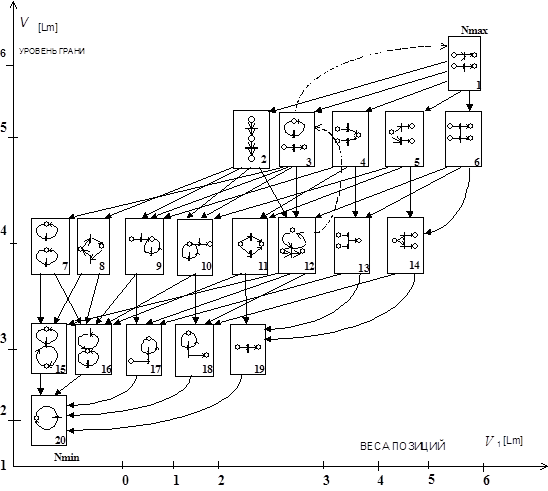 N6 . Все данные структуры могут быть получены из СП-структуры Nmax путем выполнения одной операции объединения. Наибольшей нижней гранью для элемента Nmin является грань 3-го уровня, которая включает СП-структуры с N15 по N19 . Все данные структуры могут быть получены из Nmin  путем выполнения одной операции разделения. Из рис.3.2 видно, что ранг построенной структуры равен 2. Как подмножество в данную структуру входит структура с рангом 1 (элементы N19 и N20). Элементы данной структуры характеризуются тем, что они имеют либо наим.верхн. грань, либо наиб.нижн. грань. Такую структуру будем называть вырожденной.