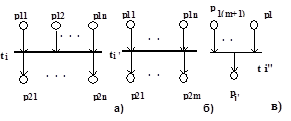 Рассмотрим более сложный тип вершины, представленный на рис. 3.4. Физический смысл данной вершины заключается в синхронизации n параллельно протекающих процессов и активизации новых m параллельных процессов, т.е. данная вершина может быть представлена, как показано на рис.3.4,б, из которого видно, что завершение n процессов порождает m новых параллельных процессов. Отсюда следует, что деление подобных структур можно проводить по вершине p (рис.3.4,в), что приводит к получению структур, описанных выше. Такой способ деления переходов будем называть горизонтальным делением.