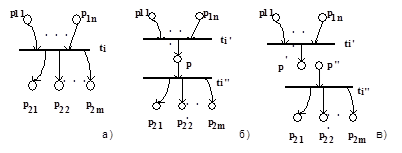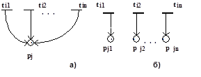 Множественное разделение переходов СП-структур. В данном пункте будем рассматривать вершины СП-структур, которые удовлетворяют условию (3.8). Физический смысл данных вершин заключается либо в синхронизации n параллельно протекающих процессов, либо в активизации m параллельных процессов. Данные процессы могут быть выделены путем разделения перехода ti на m переходов. Один из вариантов деления представлен на рис.3.3.