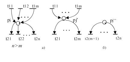 pre(ti)={p11, p12,..., pn} и post(ti) = {p21, p22,..., p2n}, то данный переход делится на n переходов (ti1, ti2,..., tin ), для которых справедливо: