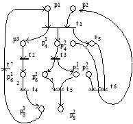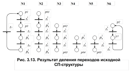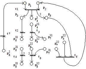 А. Вертикальное деление. На основе условия (3.9) определяем подмножество позиций P', которые подвергаются делению: P'={p4, p6, p7, p8}. В результате деления данных позиций получаем СП-структуру, изображенную на рис.3.12. На основе условия (3.8) определяем подмножество переходов T', которое также подвергается делению: T'={t1, t3, t5, t6}. В результате деления отмеченных переходов получаем СП, изображенную на рис.3.13.