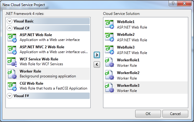 После установки Windows Azure Tools в Visual Studio появляются шаблоны Cloud Service в диалоге создания нового проекта. При выборе узла Cloud Service открываются New Cloud Service, который позволяет добавить ASP.NET Web Roles, Worker Roles or CGI Web Roles для нового проекта. Windows Azure SDK позволяет добавить более чем одну роль для каждого типа Cloud Service. Каждая роль использует отдельный экземпляр Windows Azure CPU, так минимальная стоимость запуска проекта в облаке будет примерно 4 * $0.12 = $0.48 в час.