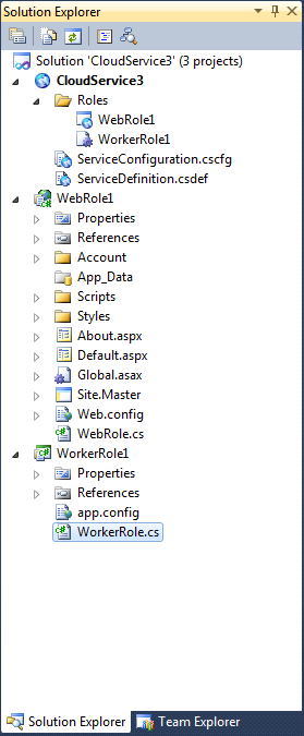Добавив указанные роли и нажав ОК, откроется новое решение с проектами WebRole и Worker-Role в Solution Explorer как показано на рисунке 6.2.