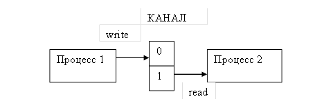 Системный вызов pipe создает механизм ввода/вывода, называемый каналом, и возвращает два дескриптора файла fildes[0] и fildes[1]. Дескриптор fildes[0] открыт на чтение, дескриптор fildes[1] - на запись.