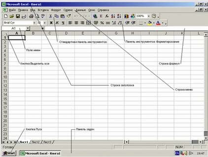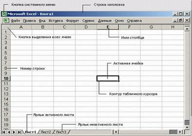 Окно рабочей книги Excel с его основными элементами показано на рис. 2. В книге может содержаться до 255 рабочих листов. В каждый конкретный момент времени активным может быть только один рабочий лист.