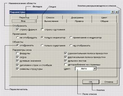 Диалоговое окно Параметры содержит следующие вкладки: Вид, Вычисления, Правка, Общие, Переход, Списки, Диаграмма, Цвет.