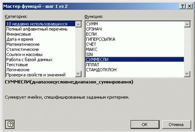 Окно состоит из двух связанных между собой списков: Категория и Функция. При выборе одного из элементов списка Категория в списке Функция появляется соответствующий ему перечень функций. В Microsoft Excel функции разбиты на 12 категорий. Категория 10 недавно использовавшихся постоянно обновляется, в зависимости от того, какими функциями вы пользовались в последнее время. Она напоминает стековую память: новая вызванная вами функция, которая в этом списке еще не числилась, займет первую строку, вытеснив тем самым последнюю функцию. Категория Полный алфавитный перечень содержит список всех функций Excel. При выборе какой-либо функции в нижней части диалогового окна появляется краткое ее описание. Нажав кнопку ОК или клавишу [Enter], вы можете вызвать панель выделенной функции.
