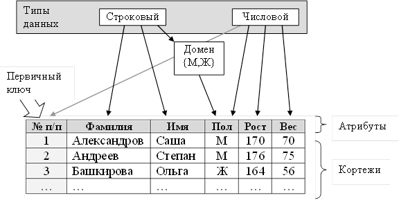 Рисунок 4.1 – Основные понятия РМД, на примере фрагмента отношения «Студент» для медпункта.