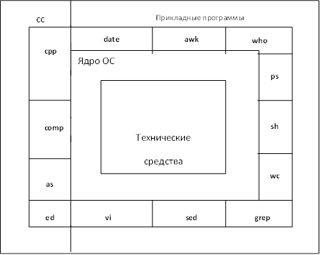 Некоторые из программ, приведенных на рисунке, в стандартных конфигурациях системы известны как команды, однако на одном уровне с ними могут располагаться и доступные пользователю программы, такие как программа a.out, стандартное имя для исполняемого файла, созданного компилятором с языка Си. Другие прикладные программы располагаются выше указанных программ, на верхнем уровне, как это показано на рисунке. Например, стандартный компилятор с языка Си ('cc') располагается на самом внешнем слое: он вызывает препроцессор для Си, ассемблер и загрузчик (компоновщик), т.е. отдельные программы предыдущего уровня.