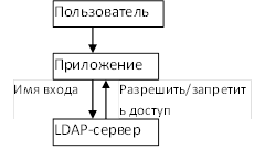 Пользователь предоставляет приложению свои имя и пароль, после чего приложение отправляет эту информацию LDAP-серверу, который разрешет или запрещает доступ этого пользователя к приложению. В качестве LDAP-сервера использеутся Open-LDAP в паре с Samba (в Unix-подобных системах) либо Active Directory (в Windows).