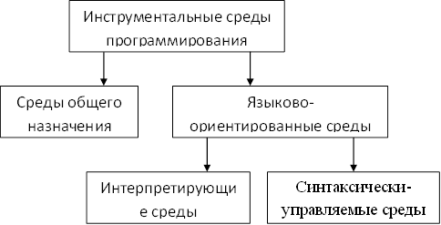 Интерпретирующая инструментальная среда программирования обеспечивает интерпретацию программ на данном языке программирования, т.е. содержит, прежде всего, интерпретатор языка программирования, на который эта среда ориентирована. Такая среда необходима для языков программирования интерпретирующего типа (таких, как Лисп), но может использоваться и для других языков (например, на инструментальном компьютере). Синтаксически-управляемая инструментальная среда программирования базируется на знании синтаксиса языка программирования, на который она ориентирована. В такой среде вместо текстового используется синтаксически-управляемый редактор, позволяющий пользователю использовать различные шаблоны синтаксических конструкций (в результате этого разрабатываемая программа всегда будет синтаксически правильной). Одновременно с программой такой редактор формирует (в памяти компьютера) ее синтаксическое дерево, которое может использоваться другими инструментами.