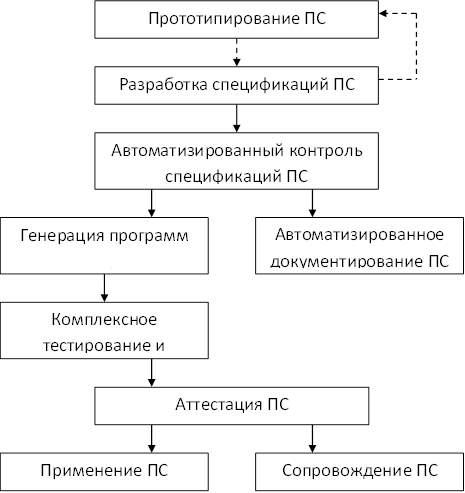 Теперь становятся понятными и основные изменения в жизненном цикле ПС для компьютерной технологии. Если при использовании ручной технологии основные усилия по разработке ПС делались на этапах собственно программирования (кодирования) и отладки (тестирования), то при использовании компьютерной технологии - на ранних этапах разработки ПС (определения требований и функциональной спецификации, разработки архитектуры). При этом существенно изменился характер документации. Вместо целой цепочки неформальных документов, ориентированной на передачу информации от заказчика (пользователя) к различным категориям разработчикам, формируются прототип ПС, поддерживающий выбранный пользовательский интерфейс, и формальные функциональные спецификации (иногда и формальные спецификации архитектуры ПС), достаточные для автоматического синтеза (генерации) программ ПС (или хотя бы значительной их части). При этом появилась возможность автоматической генерации части документации, необходимой разработчикам и пользователям. Вместо ручного программирования (кодирования) - автоматическая генерация программ, что делает не нужной автономную отладку и тестирование программ: вместо нее добавляется достаточно глубокий автоматический семантический контроль документации. Появляется возможность автоматической генерации тестов по формальным спецификациям для комплексной (системной) отладки ПС. Существенно изменяется и характер сопровождения ПС: все изменения разработчиком-сопроводителем вносятся только в спецификации (включая и прототип), остальные изменения в ПС осуществляются автоматически.