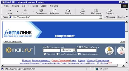 2. В окне адресов ввести адрес любого почтового Web–сервера, например, mail.ru (рис. 4.1).