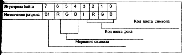 Байт атрибутов символа содержит информацию о цвете символа, цвете фона, на который должен накладываться символ и как должен отображаться символ - с мерцанием или без. Структура байта атрибутов символа для адаптера CGA-монитора представлена на рис.2.
