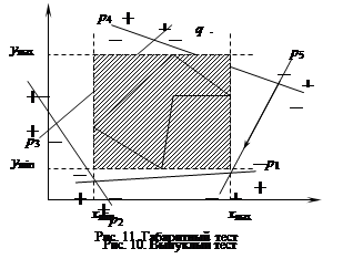 2. Габаритный тест. Определяет гарантированную непринадлежность точки q произвольному полигону P путем сравнения ее координат с габаритами полигона – минимальными и максимальными координатами его вершин. Полностью задачу ориентации габаритный тест не решает, тем не менее, благодаря своей простоте, применяется во многих алгоритмах для быстрого обнаружения заведомо непересекающихся геометрических объектов (рис. 11).