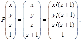 Выпишем каноническое уравнение перспективного преобразования. Пусть центр проектирования равен (0, 0, -1)Т, а картинная плоскость задается уравнением z = 1.
