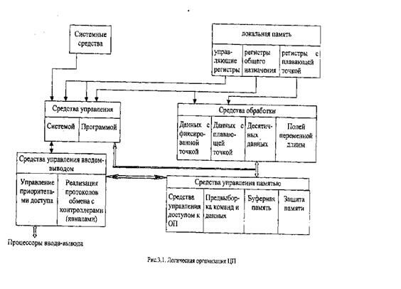 Логическую структуру ЦП представляет ряд функциональных средств (рис. 3.1): средства обработки, средства управления системой и программой, локальная память, средства управления вводом-выводом и памятью, системные средства.