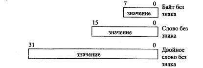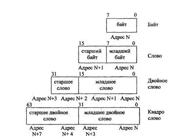 Основными типами данных в компьютерах являются байты, слова, двойные слова и квадрослова (рис.2.12.).