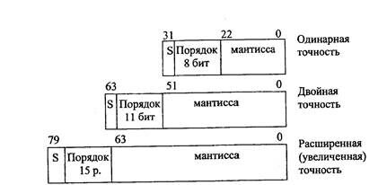 Формат включает три поля: знака, мантиссы и порядка (рис. 2.15). Поле мантиссы содержит значащие биты числа, а поле порядка содержит степень 2 и определяет масштабирующий множитель для мантиссы. Поддерживаются блоком FPU.